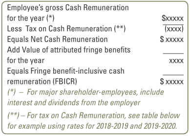Step 3: Determine the ‘Fringe Benefit-Inclusive Cash Remuneration’ (FBICR): Add the value of just the attributed fringe benefits (not the pooled benefits) to the net cash remuneration calculated in Step 2. The resulting figure is the ‘Fringe Benefit-Inclusive Cash Remuneration’ (FBICR) that is taxed according to the table in 19.2.4 above).