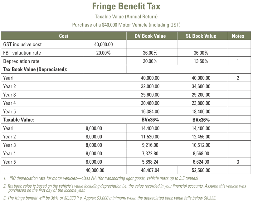 Tax book value is the cost of the vehicle if acquired after the beginning of the tax year and for subsequent years it is the vehicle’s original cost price less the total accumulated depreciation (as per the financial accounts). This option has a minimum value of $8,333 that must be used once the tax book value has depreciated to below this amount. This equates to a benefit of approx $3,000 per annum for an employee ($8,333 x 36%).