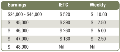 Eligible individuals earning between $24,000 and $44,000 inclusive may receive an independent earner’s tax credit (IETC) of $520 p.a. or $10 per week. The annual IETC entitlement decreases by 13 cents for every additional dollar earned above $44,000, up to $48,000. This is demonstrated in the example below.